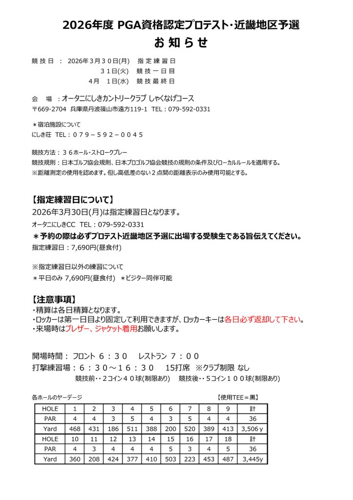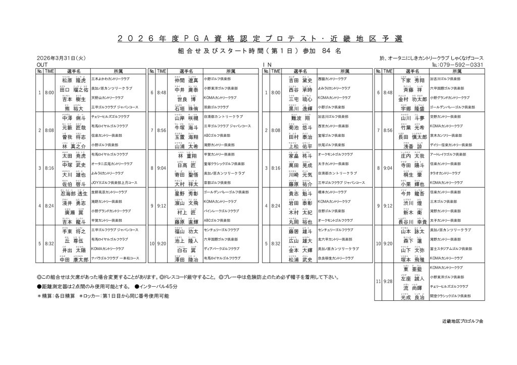 2026年度PGA資格認定プロテスト・近畿地区予選 組合せ及びスタート時間