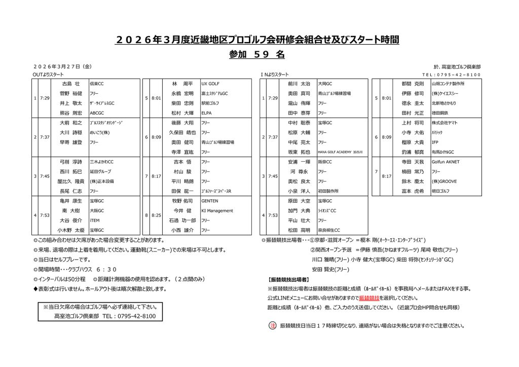 2026年3月度近畿地区プロゴルフ会研修会組合せ及びスタート時間